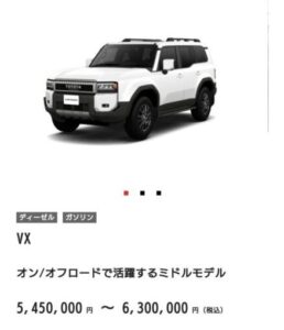 大きな理由は、エンジンラインナップがプラド時代から変わっていないからです。確かにディーゼルが6ATから8ATになるなど改良はされていますが、2.7ガソリンと2.8ディーゼルという基本構成はそのまま。それでプラドのTX-L相当(?)であるVXガソリンが545万円、乗り出し600万円〜(プラドのガソリンTX-Lは約430万)。「150プラド最上級TZ-Gと変わらないじゃん!」というのが率直な感想でした。